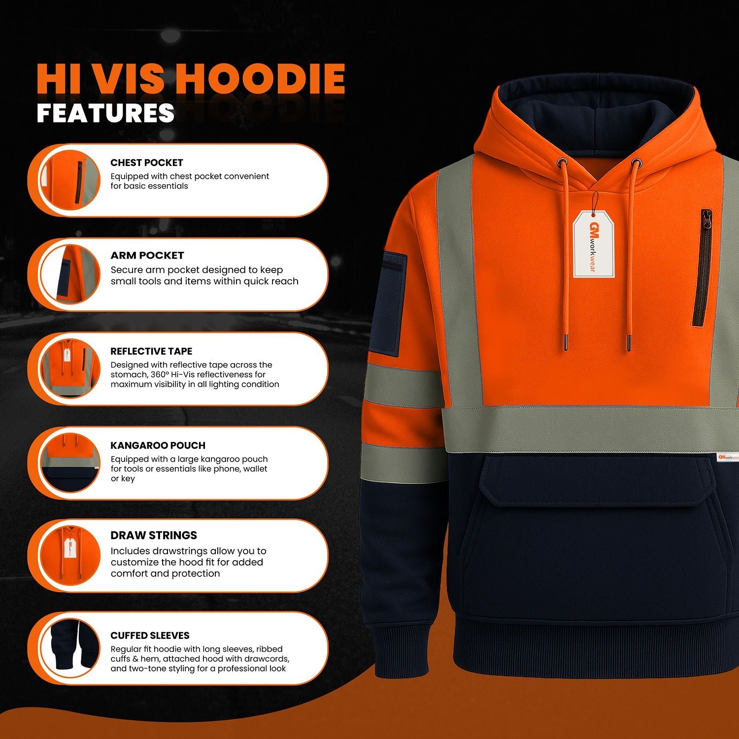 The Kangaroo / Zipped pocket provides convenient storage for small items while keeping hands warm. Designed for enhanced visibility in low-light conditions or hazardous environments.